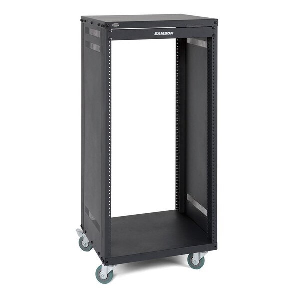 Stabil rackvogn av stål med låsbare 75mm gummihjul. Den ene siden har rackskinner med europeisk-, andre med amerikansk skruegjenger. Heldekkende sider med ventilasjonshull.