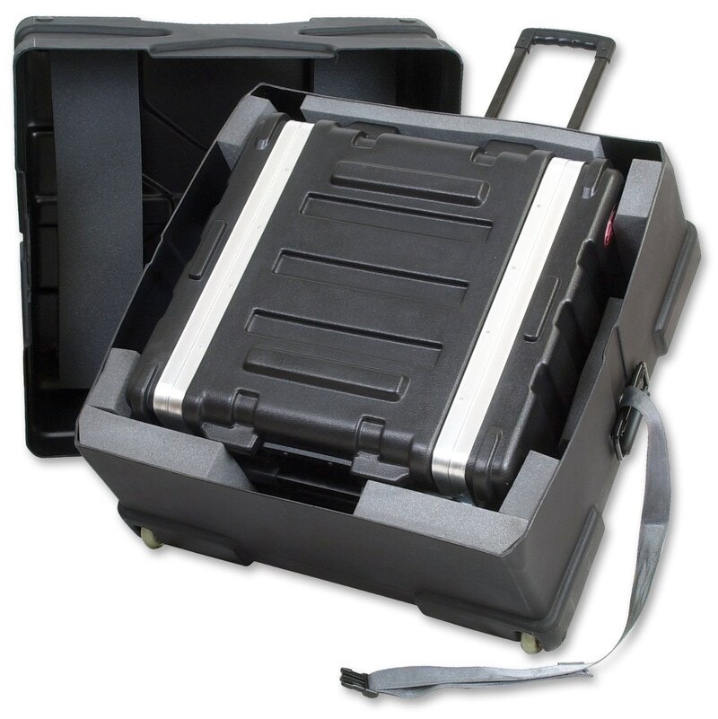 Innvendig støtdempet transportkasse med hjul og utdragbart håndtak. For støtsikker transport av 4U rack. Innvendige mål: 55 x 55 x 21,6 cm.