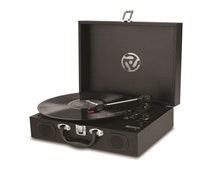 Bærbar platespiller med høyttalere og både AC-adapter og batteridrift