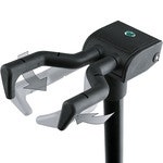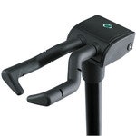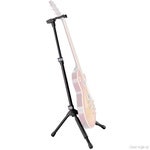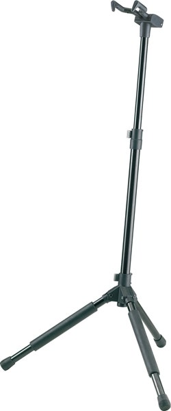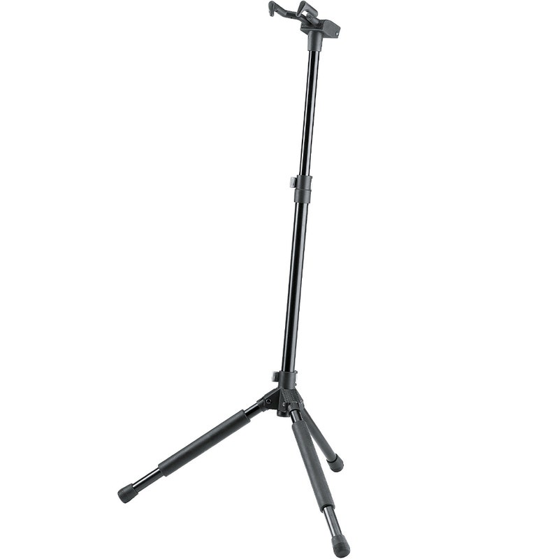 Sort gitarstativ med stillbar høyde. Fleksibelt låsesystem for instrumentets hode.
