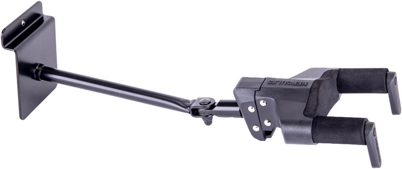 Sikker gitarrehenger med lang arm med feste som passer i slatwall/spårpanel.