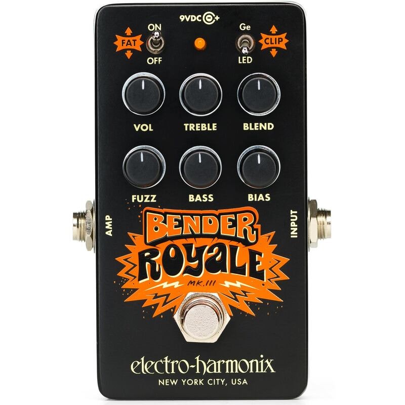 Med Fat-bryteren legges det til ekstra bass og et lavt mellomregister for å forsterke og gjøre tonen din enda fetere, og Clip-bryteren lar deg endre karakteren på hvordan tonen "klippes" og dermed endrer karakteren til selve fuzz-effekten fra Germanium til LED Fuzz, som gir en råere tone som minner om de aller tidligste fuzzpedalene. Bias-kontrollen styrer strømmen til fuzzkretsene og tar deg fra en myk, ettergivende fuzz-effekt til en overdrive som nesten skriker. For å kontrollere diskanten har Electro Harmonix valgt å bruke en aktiv diskantkontroll som tøyler eller slipper ut de høye registrene, avhengig av din preferanse eller smak. Hvis du vil kombinere Bender Royale med andre distortion- eller fuzzbokser, eller ønsker mer av det direkte signalet, hjelper Blend-kontrollen med å stille inn nivået mellom fuzz og det direkte signalet.
