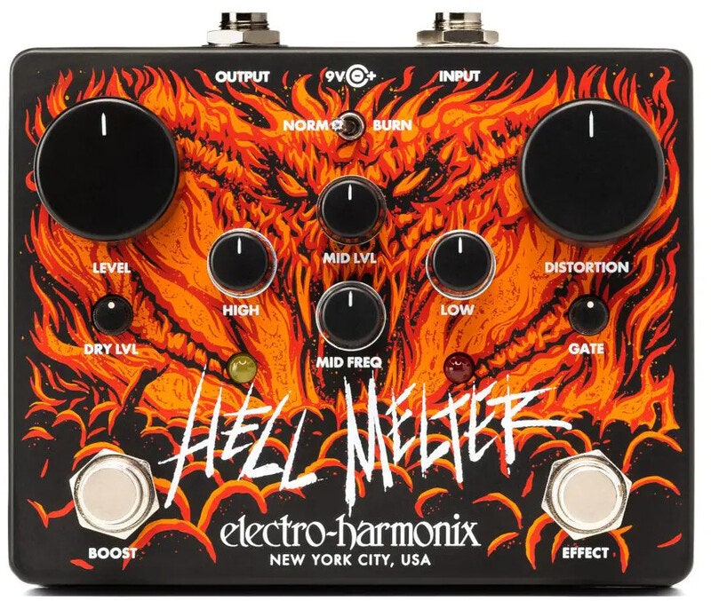EHX Hell Melter har separate Gain- og Level-kontroller, en aktiv parametrisk EQ. Dry Level-kontrollen lar deg blande inn det rene signalet ditt for å få mer bunn ut av pedalen hvis den brukes sammen med f.eks. en bass eller andre forvrengningspedaler.