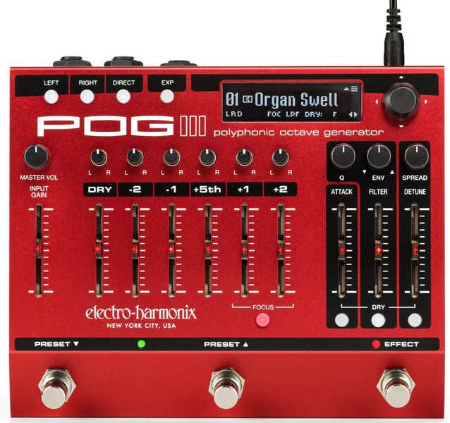 POG3 er den kraftigste oktavgeneratoren i Electro Harmonix-serien. POG3 trigger raskt, ekte og håndterer polyfoni over hele 4 oktaver. Fra å generere en effekt som ligner på en 12-strengs gitar, eller til et drawbar-orgel med opptil 6 stemmer, er det alle muligheter for å lage din egen unike lyd.