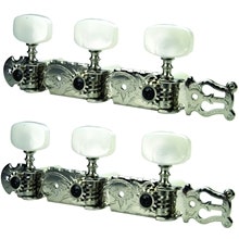Stemme- og stemmeskruesett for nylonstrenget klassisk gitar. Nickel med hvite perlemorknapper.