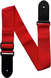 Komfortabel og justerbar gitarreim i vevd polyester, rød med sorte skinnender