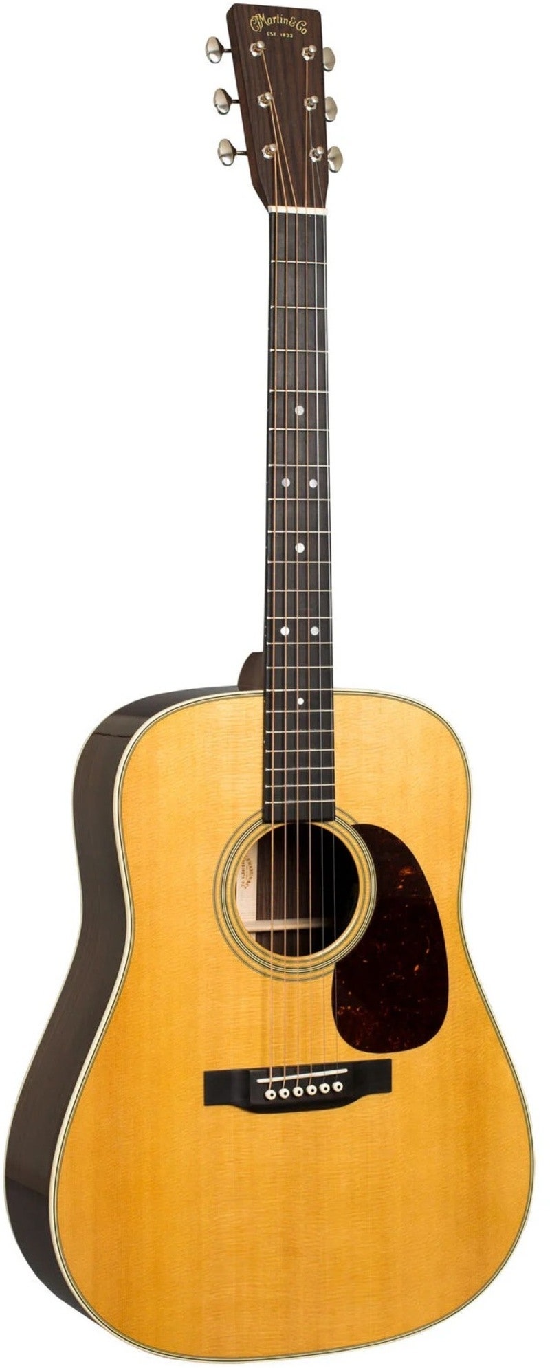 After nearly a century at the helm, and as the quintessential workhorse of music legends like Hank Williams, The Beatles, Johnny Cash, Neil Young, Bob Dylan, and so many more, Martin's legendary D-28 has been lovingly and artfully enhanced. “The post WWII D-28 had a slightly different look than its predecessor and became the centerpiece of the folk and folk rock movements at their pinnacle in the 1950s and 1960s." says Chris Martin, Chairman and CEO of Martin Guitar, "We have extracted the finest features from the D-28 of both my grandfather’s and my father’s respective eras.” The all new D-28 blends the rich history of the guitar with Martin’s newest and most heralded innovations. The 184 year old guitar maker has combined vintage appointments, including open gear tuners, an aged toner top, antique white accents, and a faux tortoise pickguard with a new neck profile to give D-28 enthusiasts a modern feel and comfortable playing experience. Martin has also added forward-shifted bracing to allow greater vibration of the top. The legend just got better!
