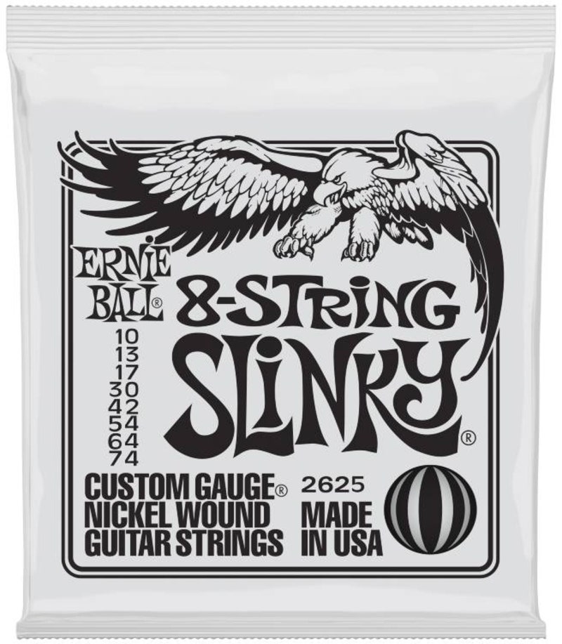 Artikkelnummer 1102625Sett for 8-strengs gitarer med litt tykkere A- og E6-strenger. 8-strengs Slinky 10-74 strengesett