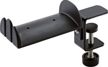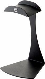 Bordsställ för hörlurar, svart, robust, tillverket i metall.