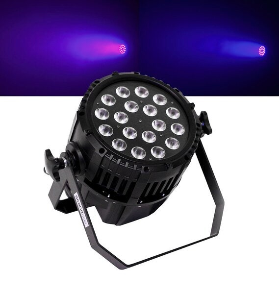 Kraftig Par56 lyskaster fra Scandlight med 18 stk meget kraftige 5W LED-dioder (3in1). Diodene er av 3in1 modell, hvilket innebærer at fargemiksingen mellom RGB blir mye vakrere. Chassiset på lyskasteren er av aluminium og kan med fordel brukes utendørs i fuktige miljøer da den er IP65-klasse. Scandlight LED56 ProjectLight 18x5W har mengder av innstillinger og valgmuligheter, tilpasset nettopp dine behov. Et utrolig allsidig produkt som passer perfekt for å fargelegge vegger, scener og lokaler med. Passer like bra for mobilt bruk som for faste installasjoner på klubber, scener og studio.