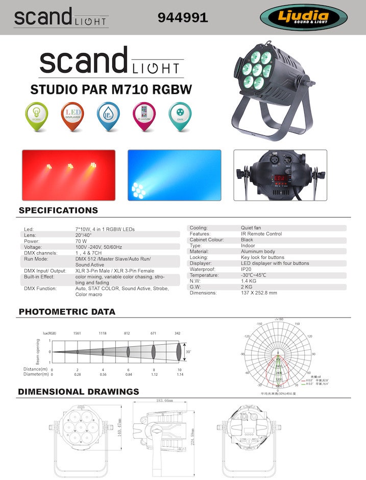 En kraftfull og stilig mini studio lydarmatur i lekker design fra Scandlight. Kassen er støpt i aluminium, og armaturen er utstyrt med hele 7 kraftige 10W RGBW LED-dioder. Scandlight studioPAR M710 RGB+W kan styres i DMX, Auto, Master/Slave eller lydstyringsmodus. Kan enkelt kontrolleres med den medfølgende fjernkontrollen. Armaturen er utrolig lyssterk til tross for sin smidige størrelse. Mange innstillingsmuligheter og bruksområder. Den stillegående viften gjør at den passer spesielt godt til lokaler hvor det skal være stillhet. Passer perfekt for å fargelegge vegger, lokaler, studioer, band, scener m.m.