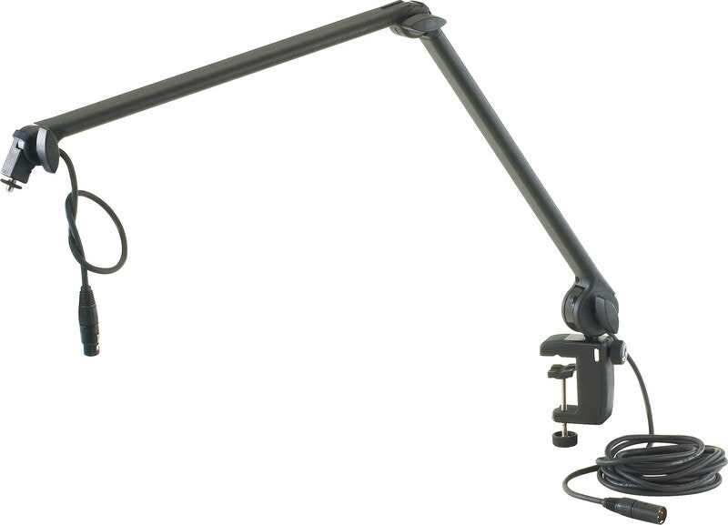 Eksklusiv vinklingsbar mikrofonarm med 3/8"-gjenger og adapter for 5/8"-gjenger. Et moderne design med tvingefeste for rask og enkel posisjonering. Den internt guidede XLR-kabelen er 6 m lang. Tvingefestet klarer bordplater opp til 53 mm men mikrofonarmen kan også festes med K&M 23855, medfølger ikke.