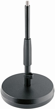 Kort 2-delt og justerbart mikrofonstativ med rund fot og vibrasjonsdempende gummiring. Sort.
