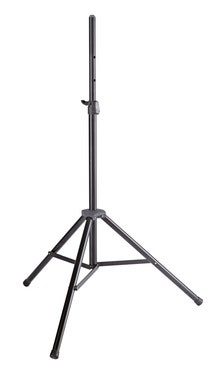 Sort høyttalerstativ med innebygd fjærsystem som forenkler rigging av høyttalere. Sort.