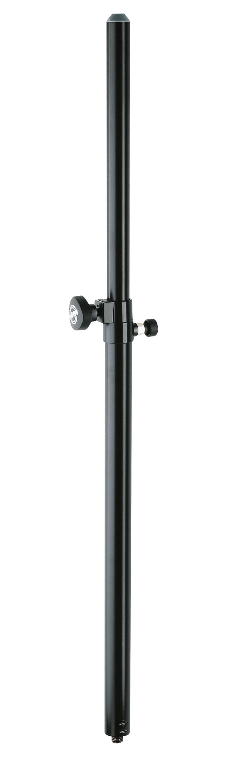 Kraftig 2-delt høyttalerstativrør i stål. Justeres med fjærende sikkerhetssplint. M20 gjenge i bunn.