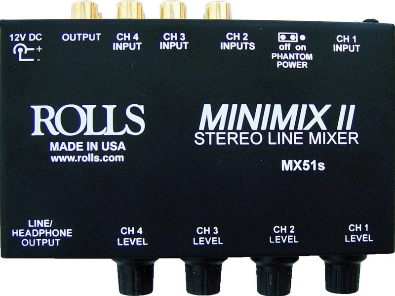 4-kanals mikser. Mikser signalene fra 1 XLR-mikrofoninngang (med fantommating), 1 RCA/3,5mm-inngang og 2 RCA-innganger.