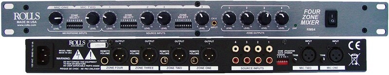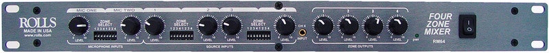 Rackmonterbar 4-sone mikser for 2 mikrofoner og 4 line-kilder. Hver lydkilde kan kobles til valgfri kombinasjon av fire soner.