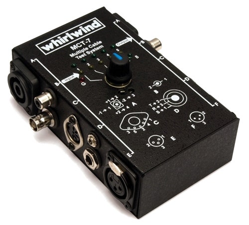 Kabeltester for XLR, TRS jack, 3.5 mm jack, 5-pols DIN, BNC, NL4 og RCA i alle kombinasjoner. Bryter gir mulighet til å teste hver leder i kabelen for å analysere den interne konfigurasjonen.