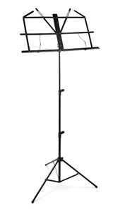 Stabilt, sammenleggbar notestander med fullt justerbar notplatta. Svart.