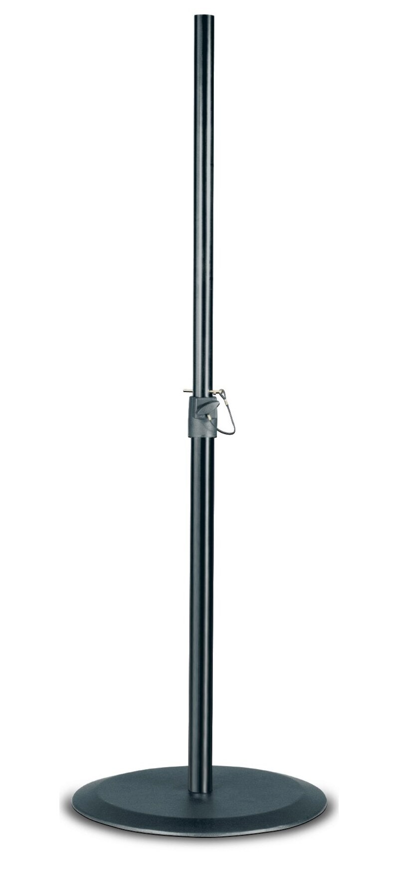 Stabilt høyttalerstativ i stål med rund fot. Justerbart i høyden.
