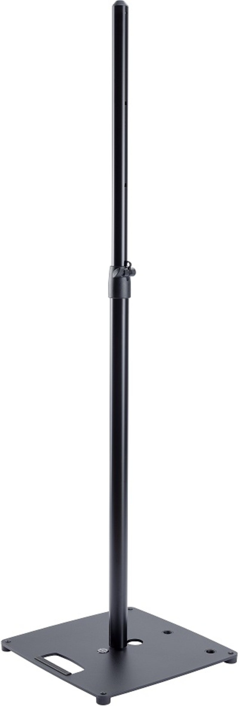 Elegant høyttalerstativ med flat stativfot (406 x 406 mm) samt bærehåndtak og innebygd kabelhåndtering. Stativet er ideelt for bruk der det er begrenset plass. Avhengig av kravene er det tre måter å plassere stativstangen på. I tillegg til sentrert og off-senter posisjon, kan stativstangen også monteres i hjørnene på stativfoten. Høyde mellom 1110 og 1810 mm og kan justeres i 4 trinn à 175 mm. Maksimal lastekapasitet er 18 kg.