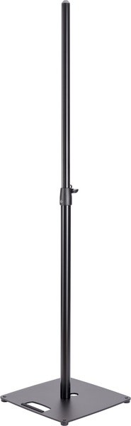 Attraktivt høyttalerstativ med flat stålplate, bærehåndtak og kabelhåndtering. Stativet er egnet for bruk der det er lite plass. Høyden er festet med en sikkerhetskrok og sikret med en støysvak, slippfri klemskrue. Den slanke utformingen av klemmen muliggjør plassbesparende transport og sikrer et stilig utseende. Brukshøyden er mellom 1135 og 1835 mm og kan nås i 5 trinn à 140 mm. Maksimal lastekapasitet når den er helt uttrukket er 15 kg.