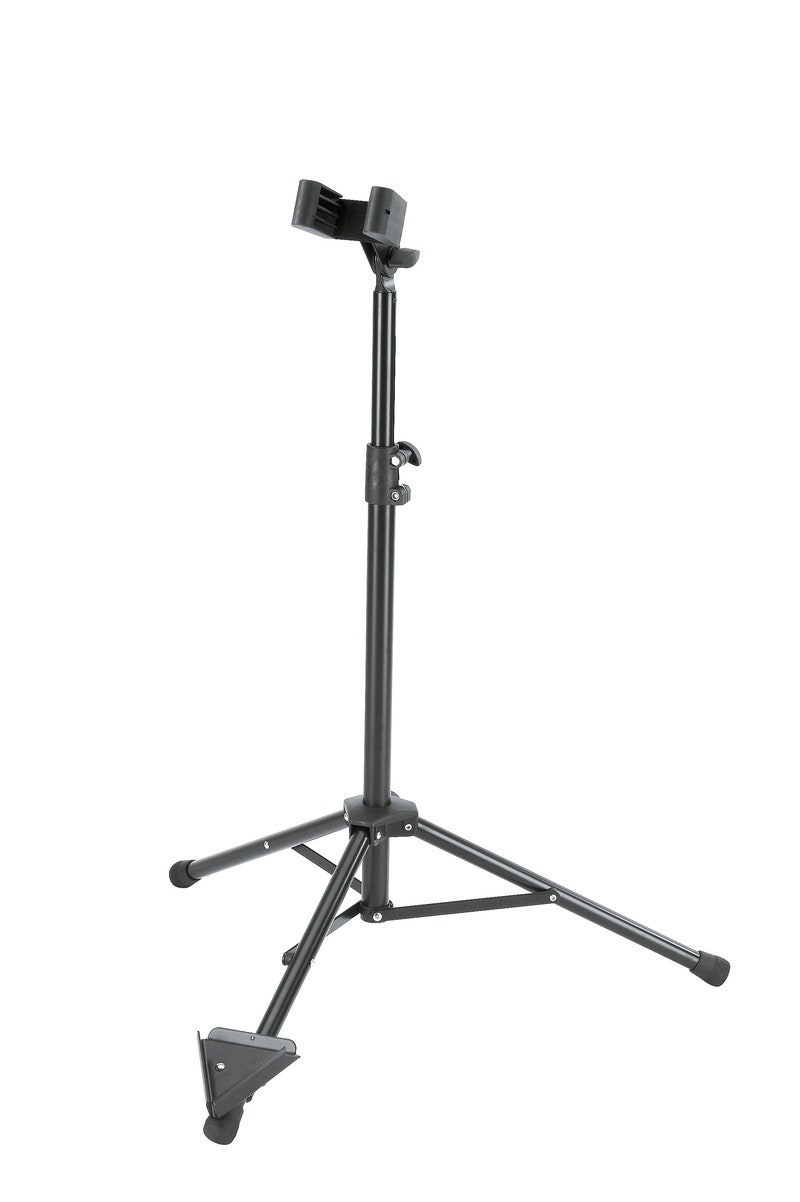 Den universelle støttebraketten kan justeres i helning og bredde. Støttebraketten kan tilpasses til instrumentet ved å endre de fjernbare gummiputene. Den nyutviklede V-formede basen for endestiften gjør det enkelt å plassere instrumentet i stativet. Stativet er lett å folde sammen for enkel transport.