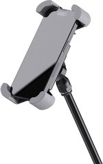 Med denne universalholderen er smarttelefonen din alltid innen rekkevidde. Holderen passer for alle flate enheter med en bredde på 55 til 85 mm. Operasjonen er rask og enkel. En hurtigutløserknapp på baksiden med låsemekanisme låser opp de gummierte klemmene og smarttelefonen kan enkelt fjernes. Takket være det fleksible kuleleddet kan holderen vippes opp og ned og roteres 360°. 3/8" eller 5/8" gjengen gjør at smarttelefonholderen kan skrus på et hvilket som helst mikrofonstativ, bordstativ eller mikrofonarm.