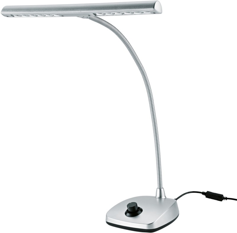 LED-belysning med varmvitt sken till piano, silverfärgad, svanhals, ca 2500 lux, gjuten metallfot, 3m strömkabel.