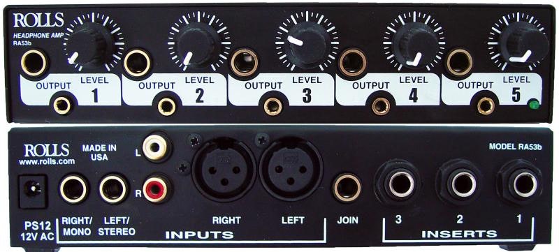 The RA53b er en kraftig hodetelefonforsterker med fem utganger for 1/4” og 1/8” (3,5mm) hodetelefoner og øretelefoner. To RA53b-enheter kan kobles sammen og monteres side om side i en universell racktray for totalt 10 utganger.