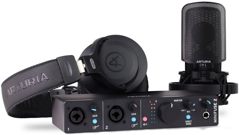 Pakke med MiniFuse 2, dynamisk mikrofon, lukkede hodetelefoner, tilbehør og programvare.