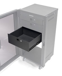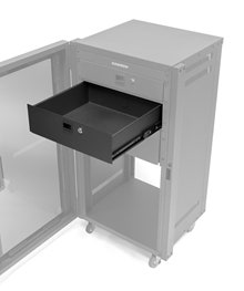 Utdragbar rackhylle med ekstra rackskinner for stabil montering i bakkant eller i siden av rack.