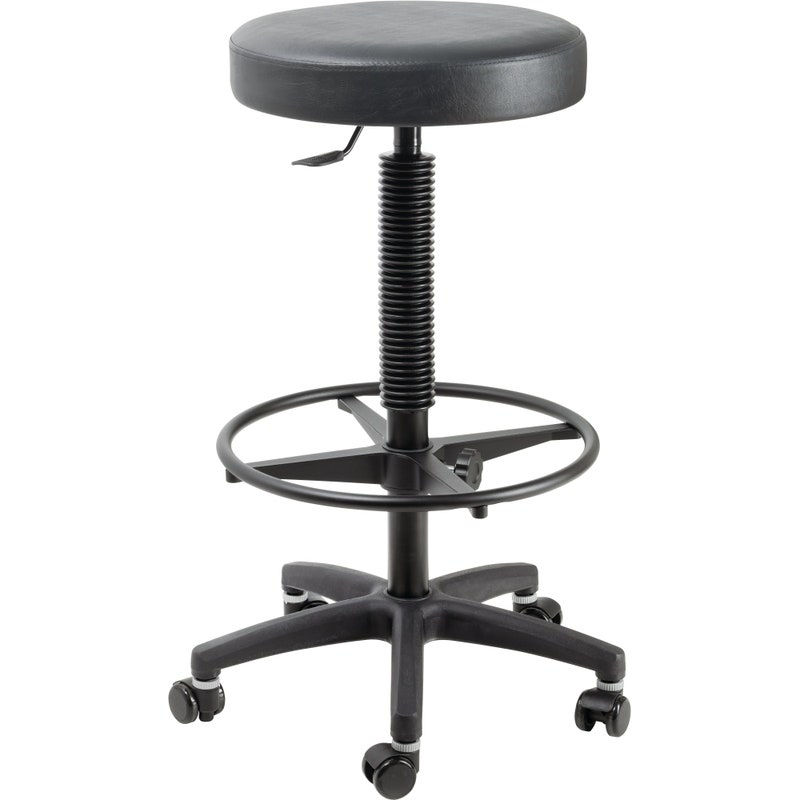 Ekstra høy pall med hjul, rund sitte og stegløs høydejustering med pneumatisk fjær.