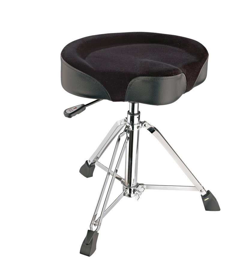 Den solide drummersetet tilbyr den kvaliteten, komforten og stabiliteten profesjonelle trommeslagere krever. Den ergonomisk formede og utsøkt polstrede setet med svettebeskyttende fløyelsdeksel balanserer overlegen bakre støtte og bevegelsesfrihet. Den komfortable høydejusteringen skyldes en integrert pneumatisk fjær, som frigjøres med en spak under setet. Den kontinuerlige høydejusteringen varierer fra 495 til 680 mm. De tre dobbeltsveisede bena og store gummiføtter garanterer en stabil stand. Den matchende bagen 14003 er tilgjengelig som tilvalg.