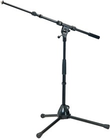 Lågt mikrofonstativ med 2-delad bom og kraftige ben. Høyde: 280 mm. Svart.