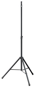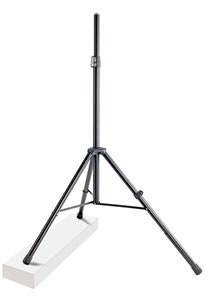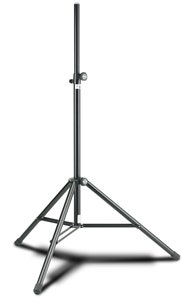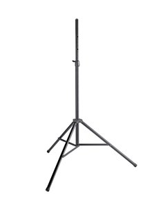 Sort høyttalerstativ med innebygd fjærsystem som forenkler rigging av høyttalere. Sort.